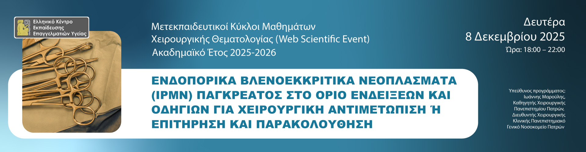 WEB SCIENTIFIC EVENT 08/12/2025 ΕΝΔΟΠΟΡΙΚΑ ΒΛΕΝΟΕΚΚΡΙΤΙΚΑ ΝΕΟΠΛΑΣΜΑΤΑ (IPMN) ΠΑΓΚΡΕΑΤΟΣ ΣΤΟ ΟΡΙΟ ΕΝΔΕΙΞΕΩΝ ΚΑΙ ΟΔΗΓΙΩΝ ΓΙΑ ΧΕΙΡΟΥΡΓΙΚΗ ΑΝΤΙΜΕΤΩΠΙΣΗ Ή ΕΠΙΤΗΡΗΣΗ ΚΑΙ ΠΑΡΑΚΟΛΟΥΘΗΣΗ - ΕΚΠΑΙΔΕΥΤΙΚΟ ΠΡΟΓΡΑΜΜΑ 2025-2026